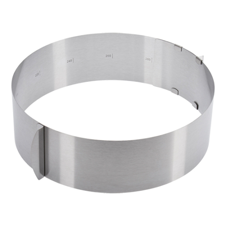Een taartring met een verstelbare diameter van Ø16 tot Ø30 cm is een veelzijdig en onmisbaar hulpmiddel voor elke bakliefhebber of professionele patissier. Deze taartring is vervaardigd uit hoogwaardig roestvrij staal, wat zorgt voor duurzaamheid en een lange levensduur. Het materiaal is bestand tegen corrosie en gemakkelijk schoon te maken, waardoor het ideaal is voor regelmatig gebruik in de keuken.